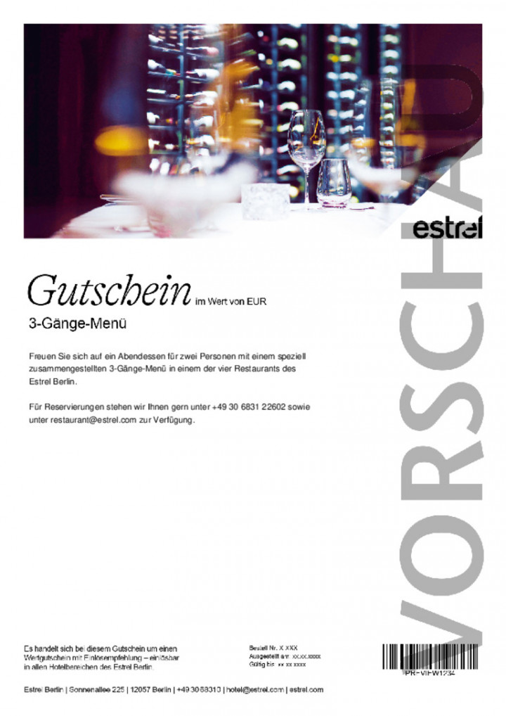 Es handelt sich bei diesem Gutschein um einen Wertgutschein mit Einlösungsempfehlung. Eine Einlösung ist in allen Hotelbereichen des Estrel Berlin möglich. Eine Auszahlung in bar ist nicht möglich.
