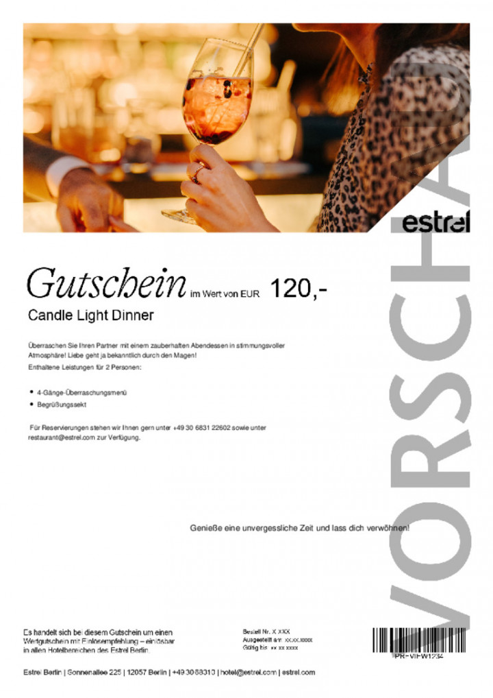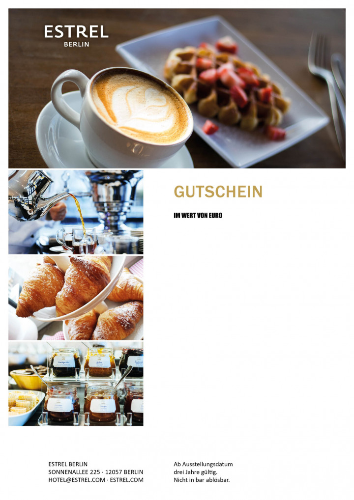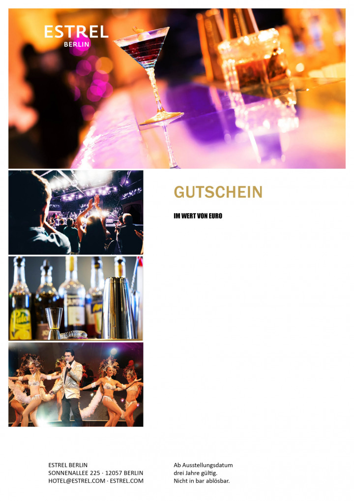 Es handelt sich bei diesem Gutschein um einen Wertgutschein mit Einlösungsempfehlung. Eine Einlösung ist in allen Hotelbereichen des Estrel Berlin möglich. Eine Auszahlung in bar ist nicht möglich
