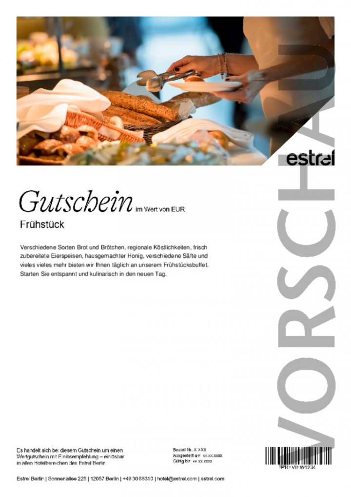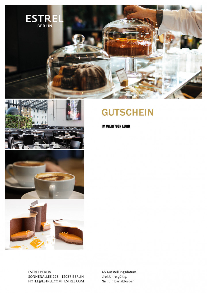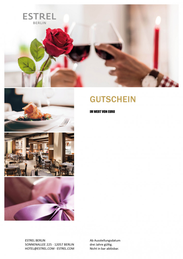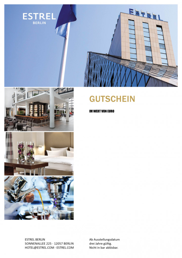 Es handelt sich bei diesem Gutschein um einen Wertgutschein mit Einlösungsempfehlung. Eine Einlösung ist in allen Hotelbereichen des Estrel Berlin möglich. Eine Auszahlung in bar ist nicht möglich.