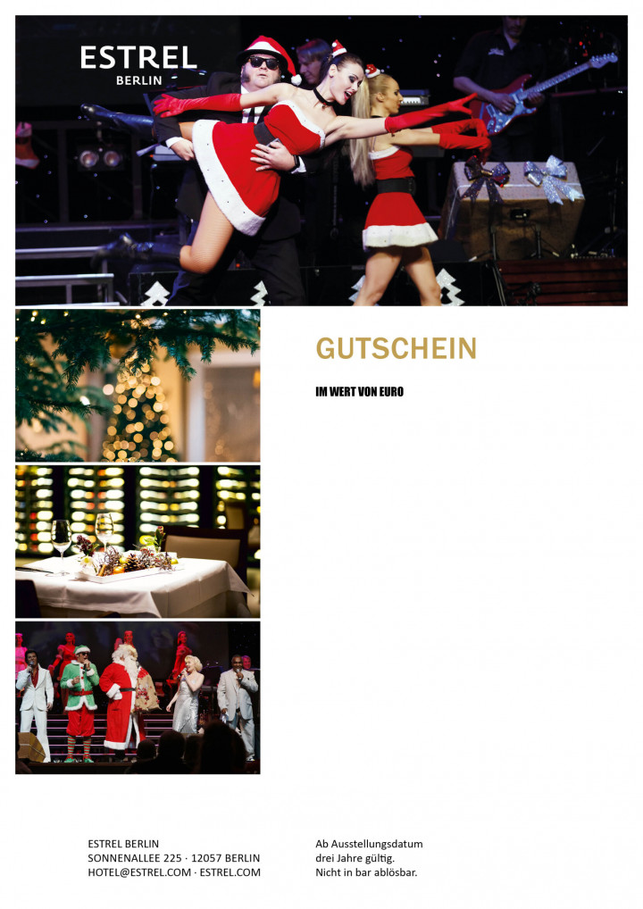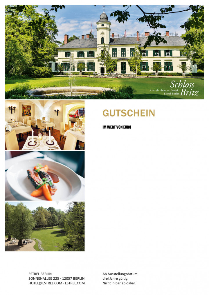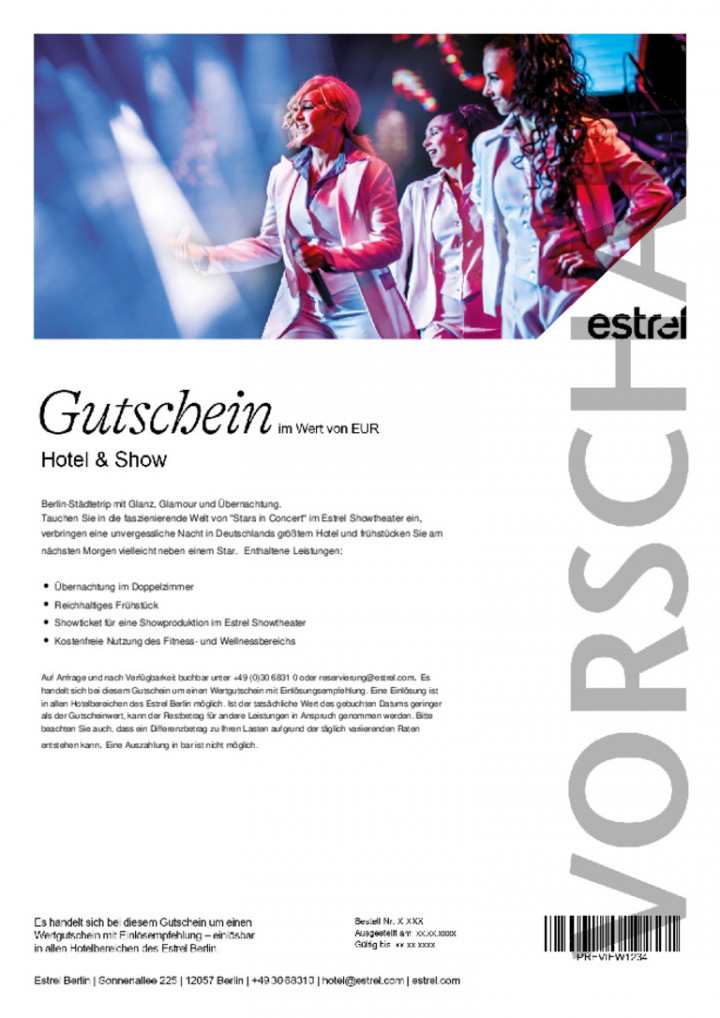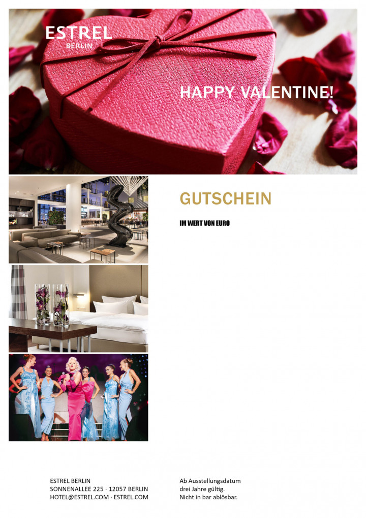 Es handelt sich bei diesem Gutschein um einen Wertgutschein mit Einlösungsempfehlung. Eine Einlösung ist in allen Hotelbereichen des Estrel Berlin möglich. Ist der tatsächliche Wert des gebuchten Datums geringer als der Gutscheinwert, kann der Restbetrag für andere Leistungen in Anspruch genommen werden. Bitte beachten Sie auch, dass ein Differenzbetrag zu Ihren Lasten aufgrund der täglich variierenden Raten entstehen kann.